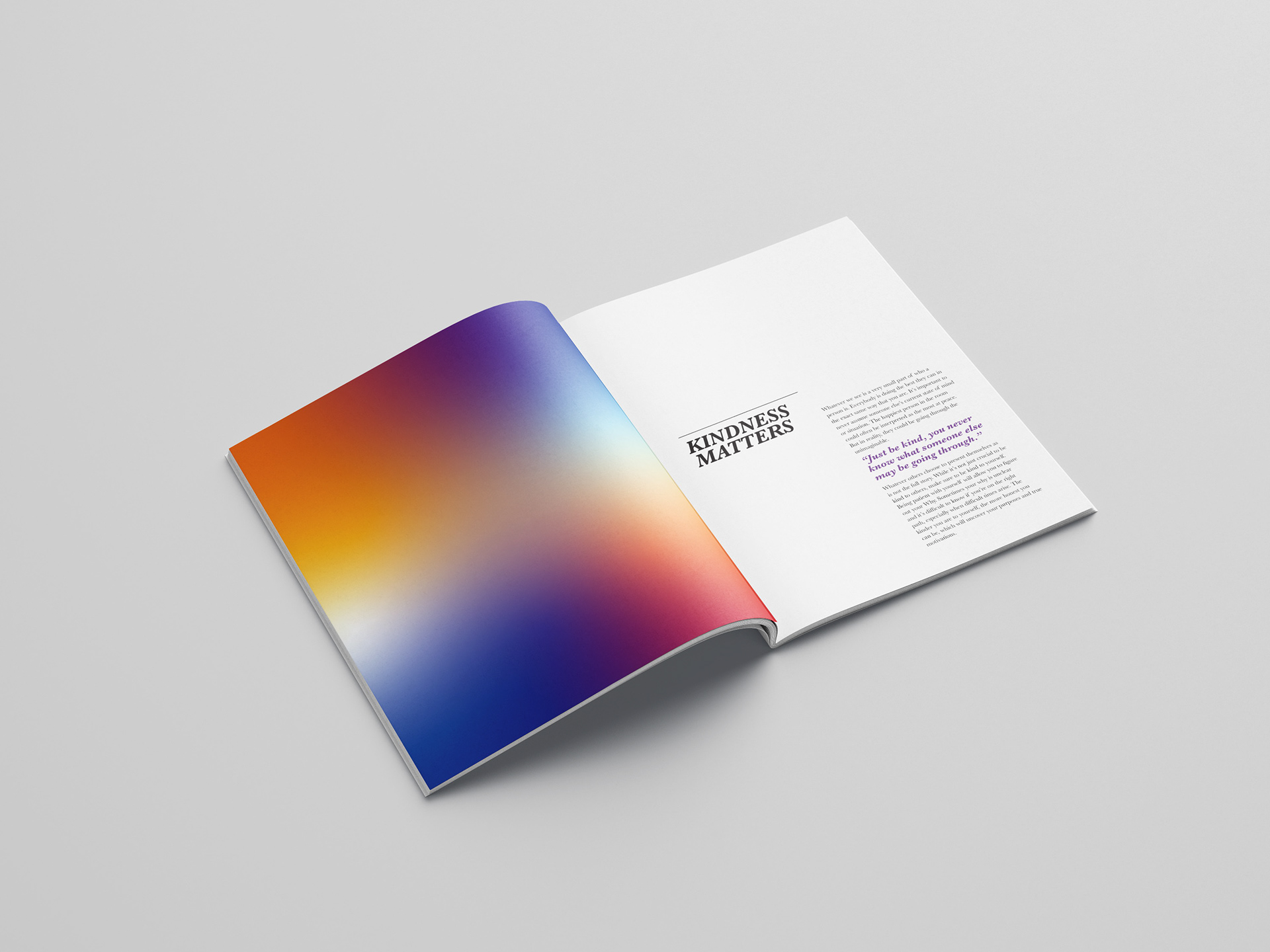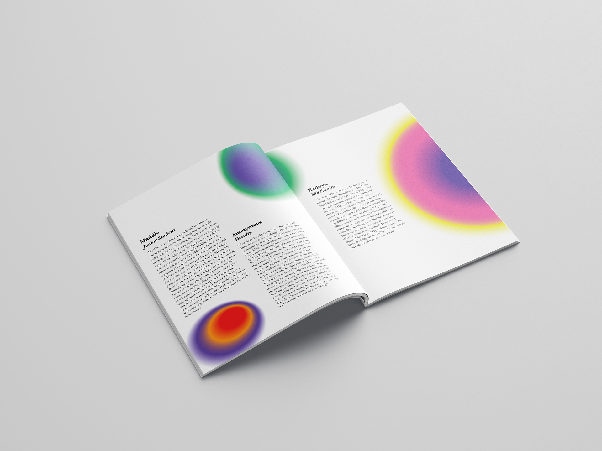 The People of Roger presents a powerful and thought-provoking exploration of community by posing the simple yet profound question, “What is your why?” to individuals from a wide range of ages, backgrounds, and roles within the community. Through stories filled with pain, joy, laughter, and love, the magazine sheds light on the often unspoken narratives and deeply personal experiences that influence the lives of those we encounter in our everyday routines. These stories not only give us a glimpse into the diverse lives of others but also highlight the universal truth that everyone is carrying something that may be unknown to us. In addition to the compelling stories, the publication's brand identity plays a significant role in enhancing the impact of these narratives. The use of gradients throughout the design symbolizes the unique auras and emotional layers of each individual, visually representing the diverse backgrounds, experiences, and perspectives they bring to the table. These soft yet vibrant transitions in color reflect the complexity and depth of human life—capturing the full spectrum of emotions and experiences that define a person’s journey. The People of Roger doesn’t just share individual stories; it explores the reasons and values that inspire people to wake up every day with purpose and intent. By highlighting the diverse motivations that drive each person to make an impact—whether in their personal relationships, their work, or their communities—the magazine invites readers to consider their own “why.” It encourages us to reflect on what moves us, what challenges us, and what makes us strive to leave a lasting mark on the world. Through both its design and content, the publication fosters a deep sense of connection and understanding, reminding us that we all have our own stories that deserve to be heard and appreciated.
